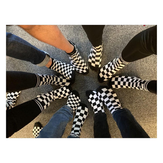 Dessa svartvita strumpor med schackknut finns i flera storlekar och ger en snygg, schackinspirerad look. Perfekt för både skolschack och vardagskläder där du vill uttrycka din passion för schack.