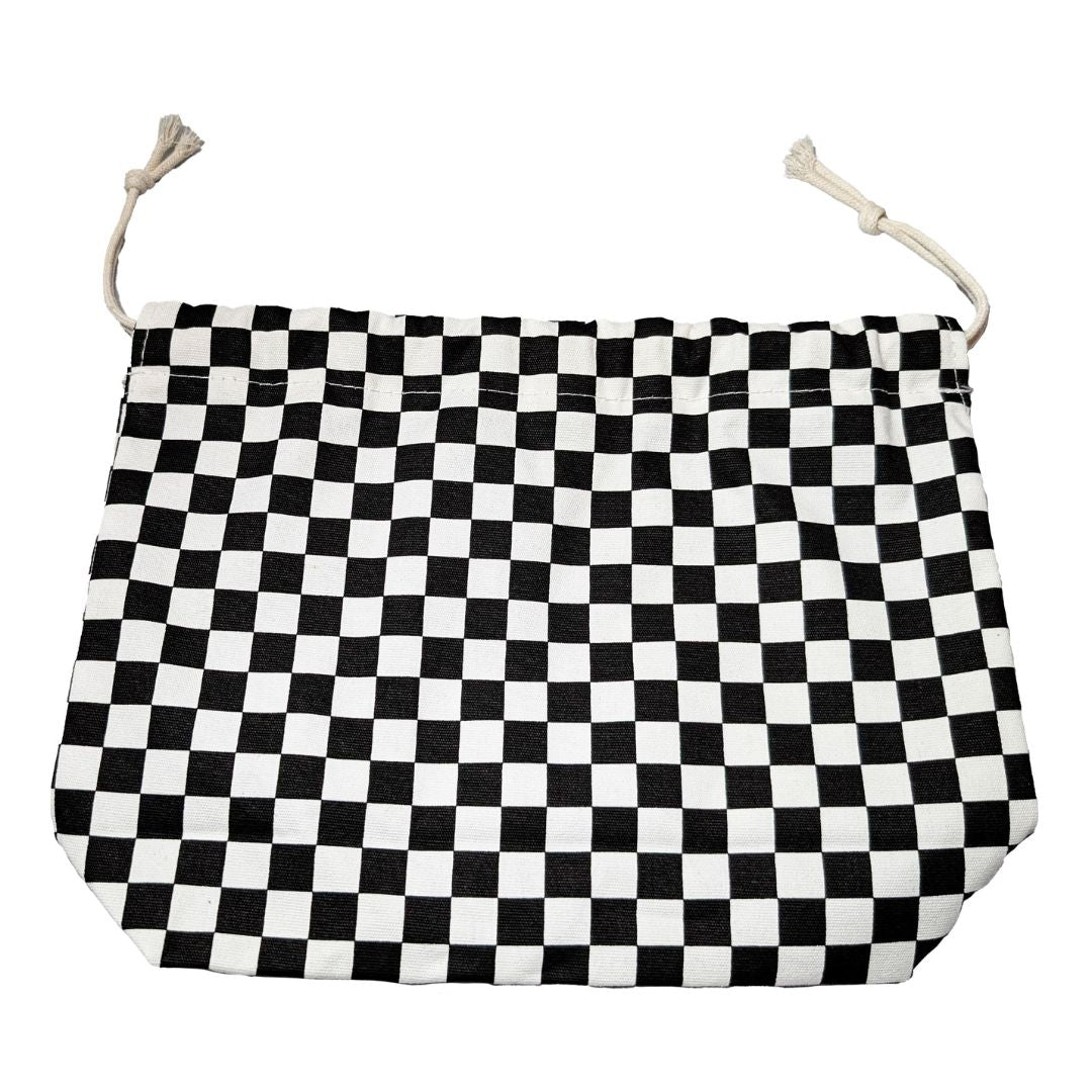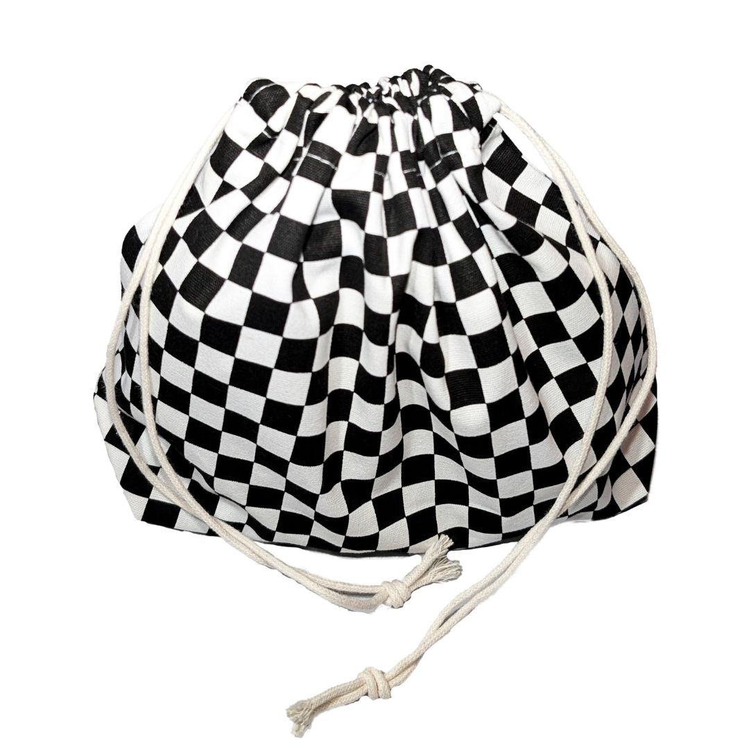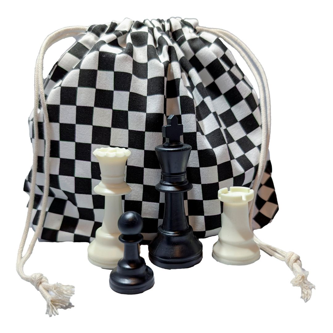 Påsen är tillverkad av ett robust vävt tyg med det klassiska svartvitrutiga mönstret. Den är försedd med en kraftig, naturfärgad dragsko i bomull som gör det enkelt och säkert att förvara pjäserna på ett säkert sätt.