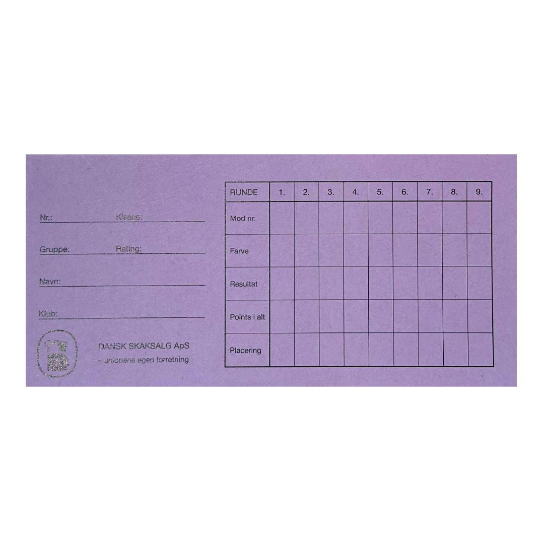 Rondkort i buntar om 100 st. Används för partier och turneringar, bland annat till att lotta Monrad upp till nio ronder. Finns i flera färger enligt anvisningarna.