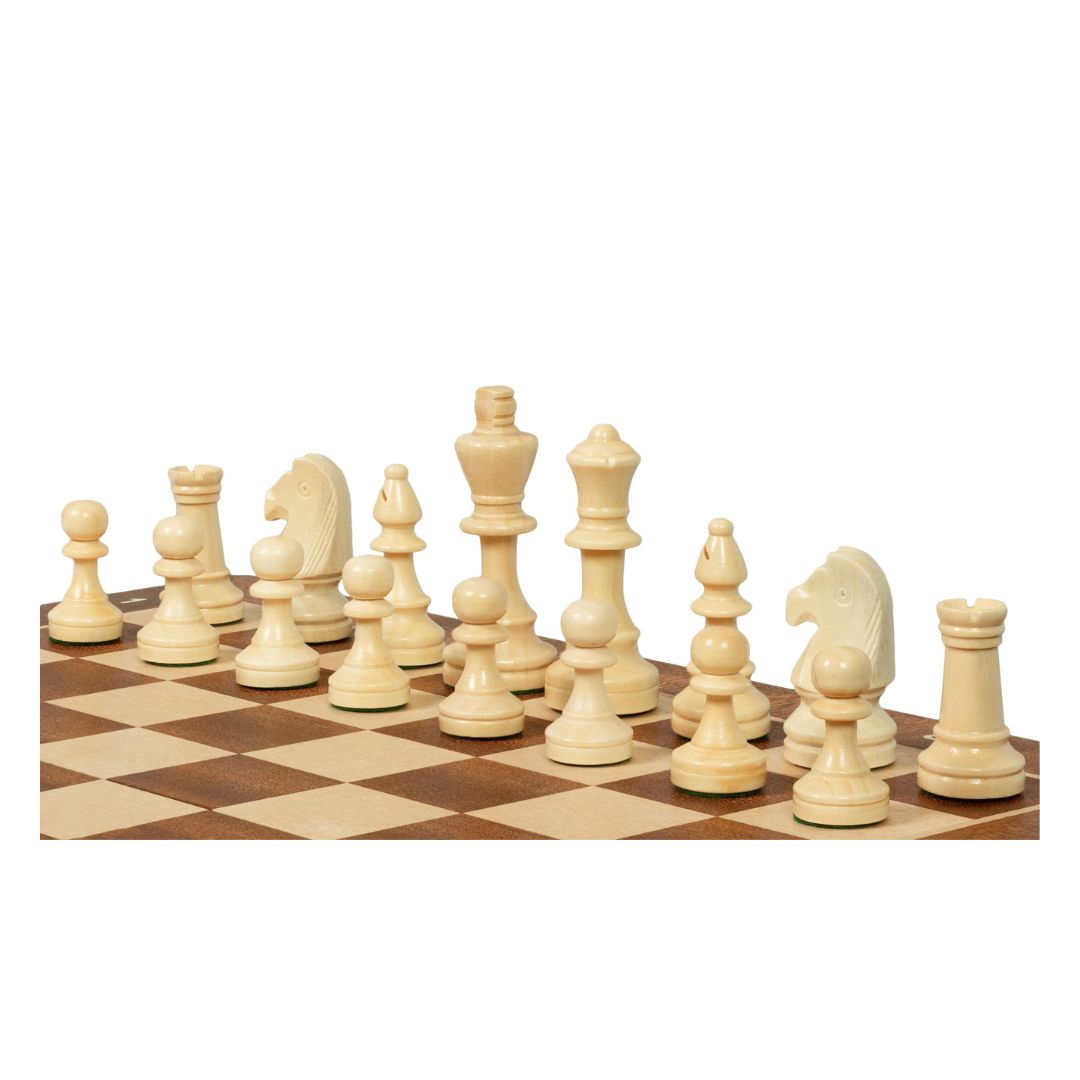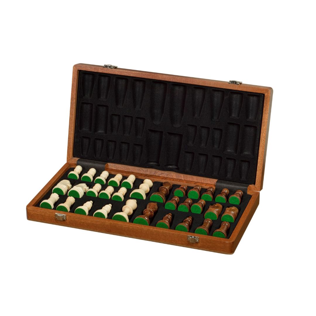 Vackert schackspel i trä. Brädet kan vikas ihop och är lätt att transportera. Pjäserna kan läggas in i brädet, så bräde och pjäser är samlat på ett ställe. Spelet är fodrat med svart filt och med plats för varje pjäs. Pjäserna har grön filt i botten.