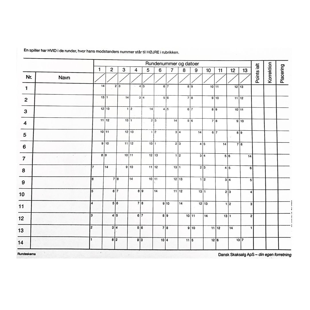 Detta schema har skapats för större turneringar med upp till 14 deltagare. Varje spelare möter varandra en gång, och motståndarnas nummer är lätta att hitta för varje omgång.