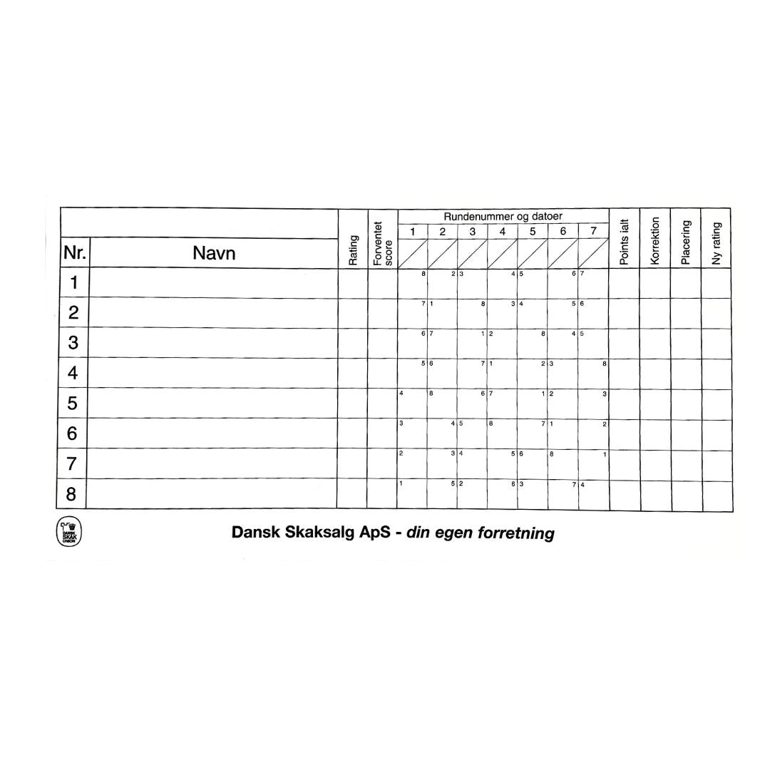 Detta schema är skapat för mindre turneringar med upp till 8 deltagare. Varje spelare möter varandra en gång, och motståndarnas nummer är lätta att hitta för varje omgång. Bredvid matcherna finns sektioner för poäng, korrigeringar och rankningar, så att hela turneringen kan följas på nära håll och uppdateras snabbt.