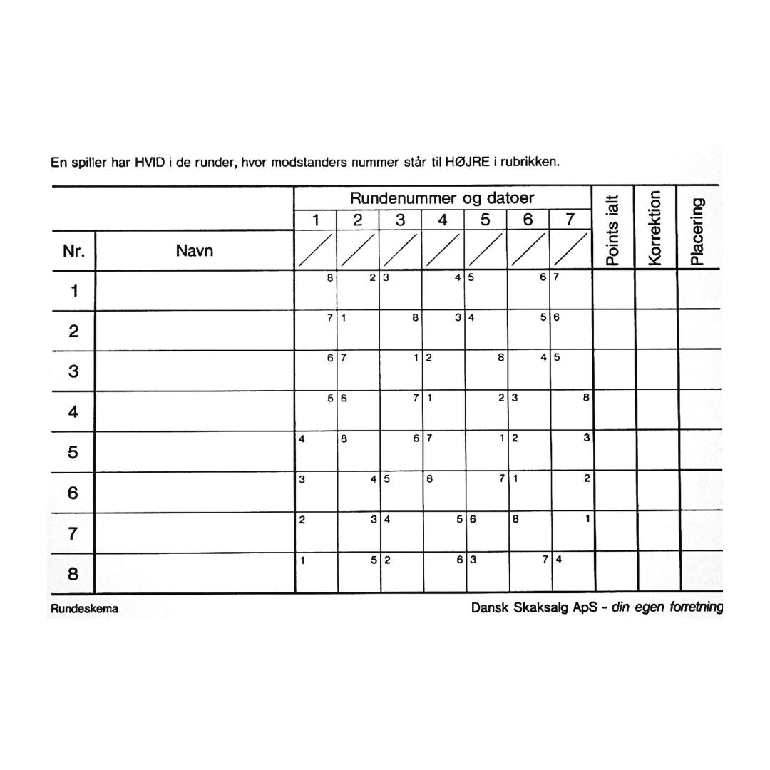 Detta schema är skapat för mindre turneringar med upp till 8 deltagare. Varje spelare möter varandra en gång, och motståndarnas nummer är lätta att hitta för varje omgång.